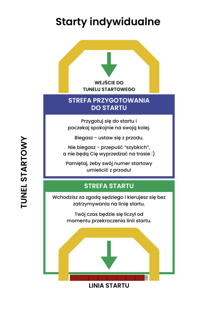 Starty indywidualne pozwalają zawodnikom wyruszyć na trasę „na spokojnie”, unikając tłoku i stresu związanego ze startem wspólnym, ale… wymagają odrobiny współpracy z Waszej strony;). Po pierwsze – bez obaw – wszyscy zdążą wystartować, jeśli w trakcie startów okaże się, że jest taka konieczność, czas w którym można wystartować zostanie wydłużony. Po drugie – wyprzedzanie na trasie (szczególnie na początku) jest trudne zarówno dla wyprzedzającego, jak i wyprzedzanego, żeby tego uniknąć prosimy Was o ustawianie się w kolejce do startu zgodnie z zasadą: biegasz – ustaw się z przodu, nie biegasz – przepuść „szybkich”, a nie będą Cię wyprzedzać:). Po trzecie – to właściwie tyle – mapa do ręki, uśmiech na twarz i można ruszać na trasę!