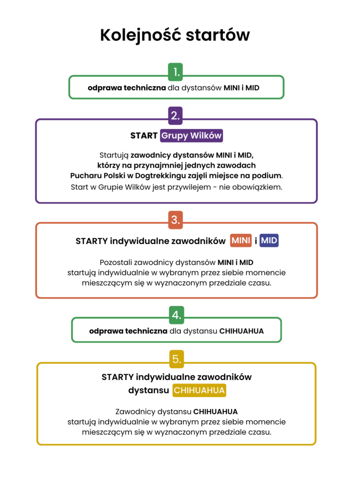 W przypadku startów rozłożonych w czasie większość zawodników startuje indywidualnie (z wyjątkiem Grupy Wilków, o której piszemy dalej), co oznacza że mogą wyruszyć na trasę w wybranym przez siebie momencie, mieszczącym się w wyznaczonym przedziale czasu podanym w programie zawodów. Zawodnicy startujący indywidualnie klasyfikowani są na podstawie czasu netto, czyli od przekroczenia linii startu do przekroczenia linii mety. Wyjątkiem jest Grupa Wilków, w której wystartować mogą osoby, które na przynajmniej jednych zawodach Pucharu Polski w Dogtrekkingu zajęły miejsce na podium (startują oni ze startu wspólnego i są klasyfikowani na podstawie czasu brutto).
