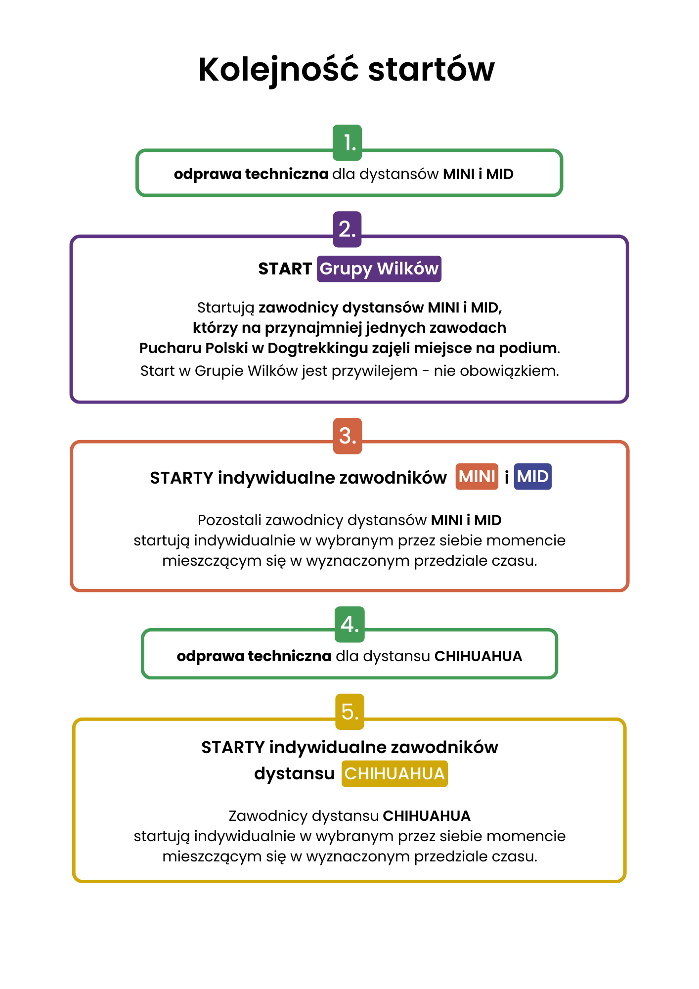 Start dogtrekkingu może zostać przeprowadzony jako start wspólny albo na zasadzie startów rozłożonych w czasie.